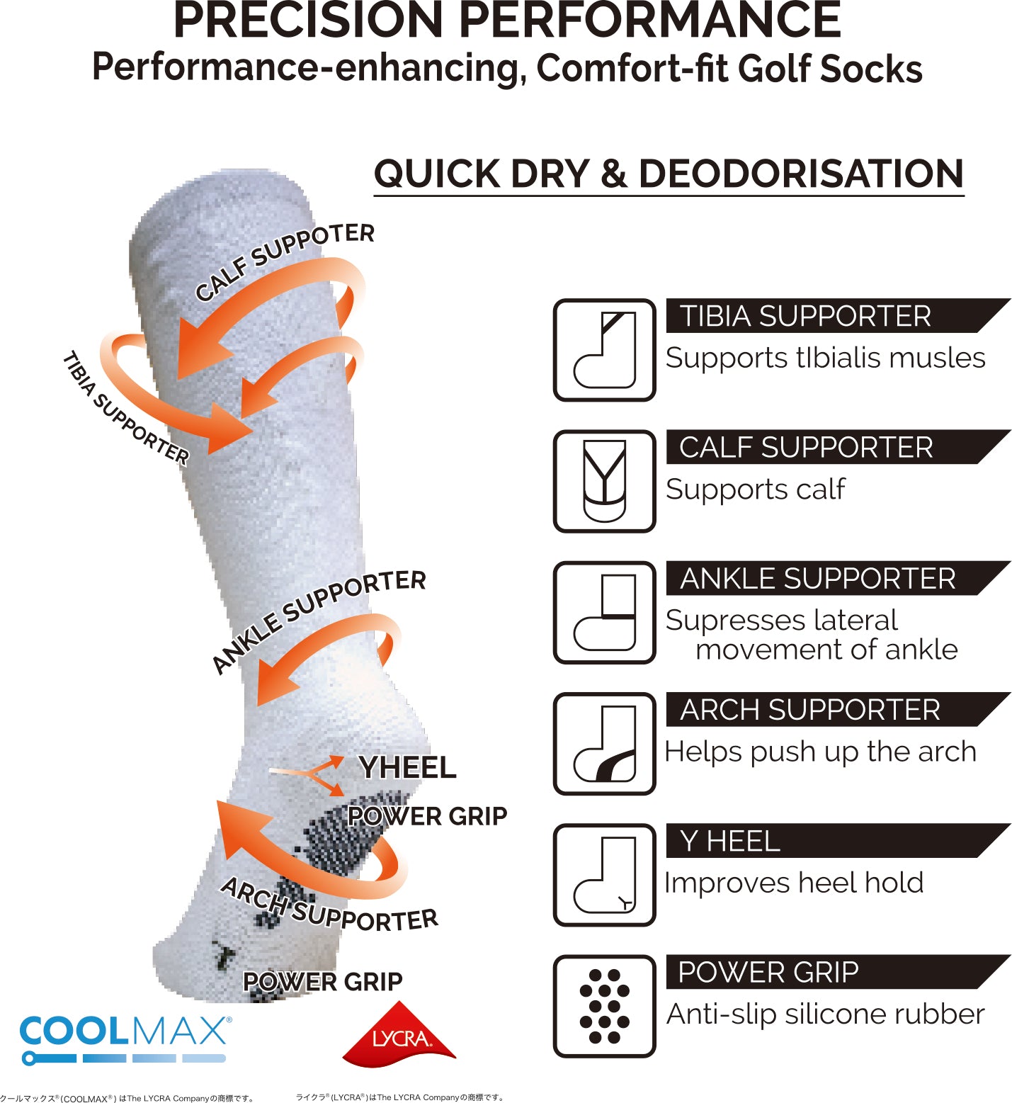 In the development of Premium Support Socks, the requirements of many professionals, such as professional golf players, professional long drive competition players and professional caddies, are incorporated in their manufacturing. The quality of the products has been highly acclaimed for their excellent functionality and durability.